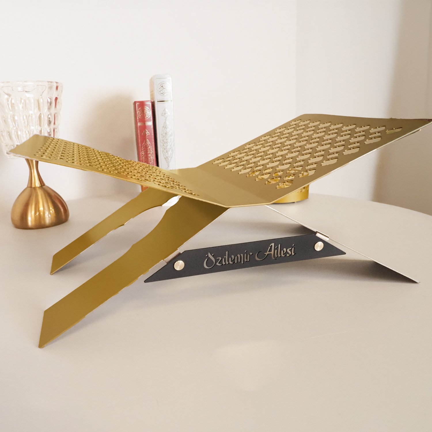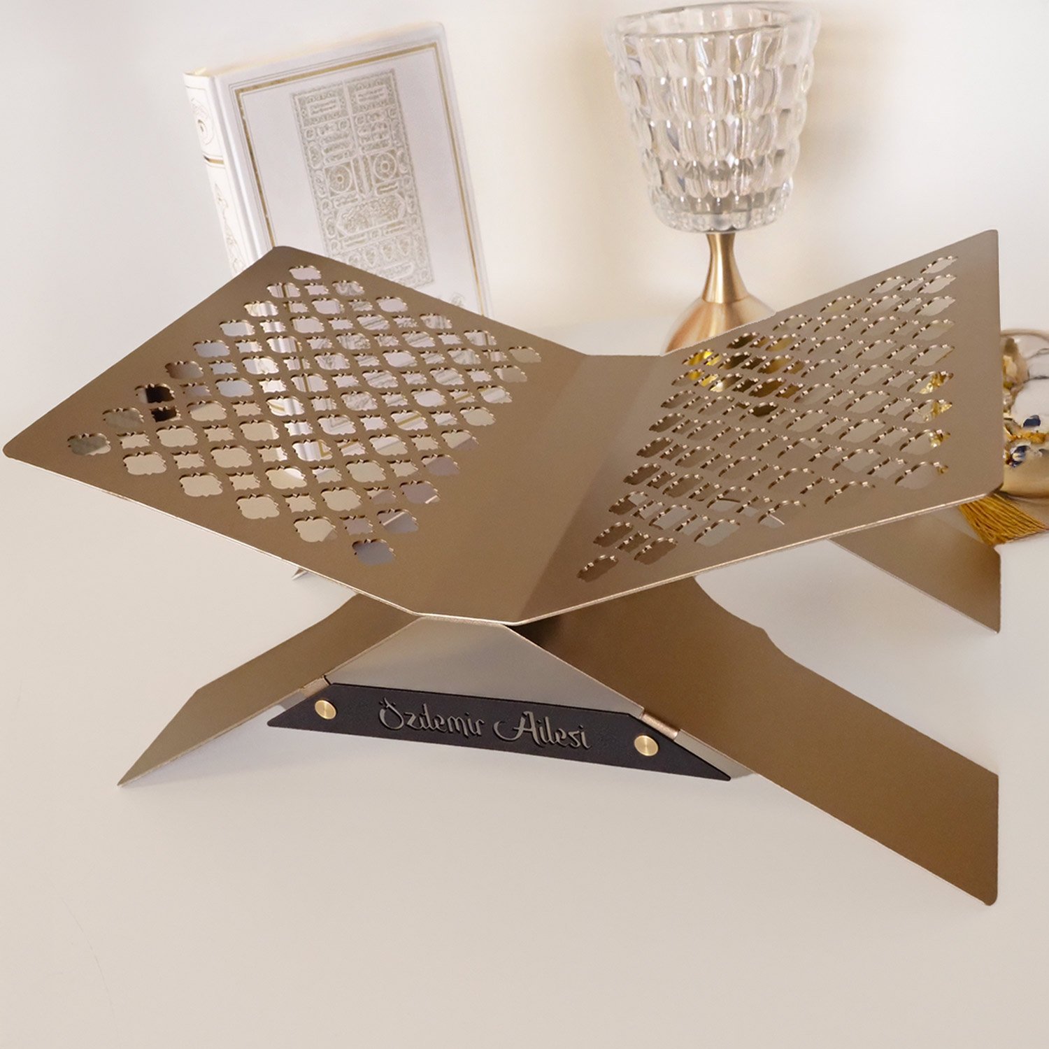 Elevate your recitation experience with this beautifully crafted foldable metal Quran stand (Rehal). Made from high-quality materials, this Quran stand is both durable and stylish. The intricate laser-cut patterns on the surface create a stunning visual, making it an ideal addition to your home or mosque.