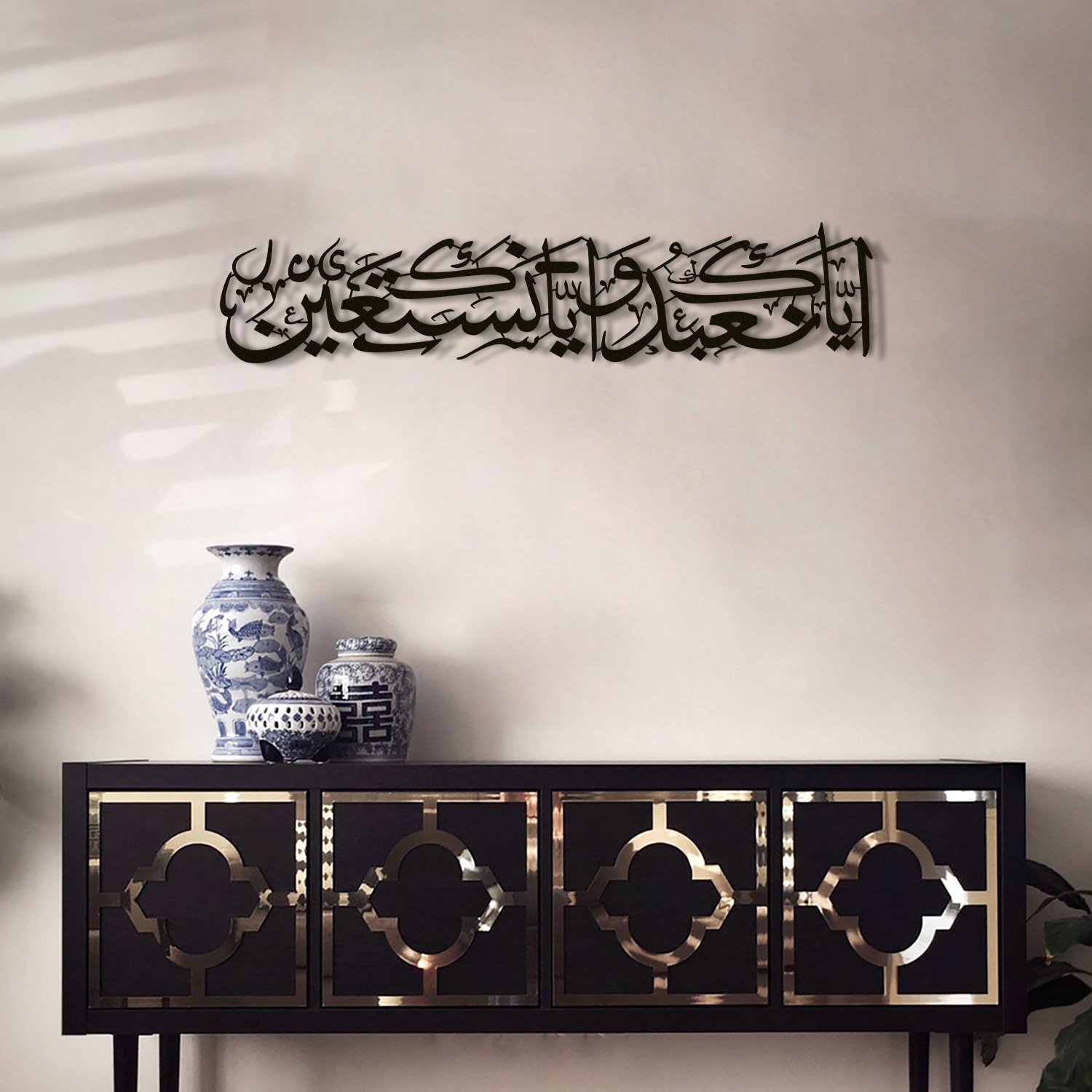 Transform your living space with this stunning Islamic wall art showcasing the fifth verse of Surah Al-Fatiha: “Iyyaaka Na’budu wa Iyyaaka Nasta’een” (You alone we worship, and You alone we ask for help). This verse, central to Islamic worship and devotion, is rendered in intricate Arabic calligraphy, creating a striking and meaningful decorative piece.